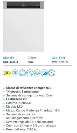 LAVASTOVIGLIE INCASSO 60 CM CON FRONTALINO INDESIT I3BL634X INOX